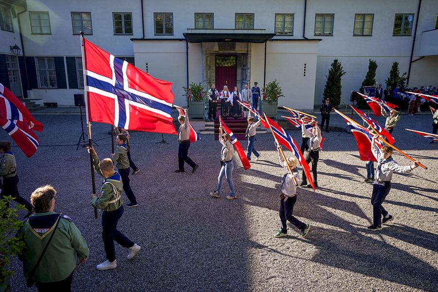 Det var strålande sol när kronprinsfamiljen vinkade till folket vid deras residens på Skaugum under den norska nationaldagen den 17 maj.