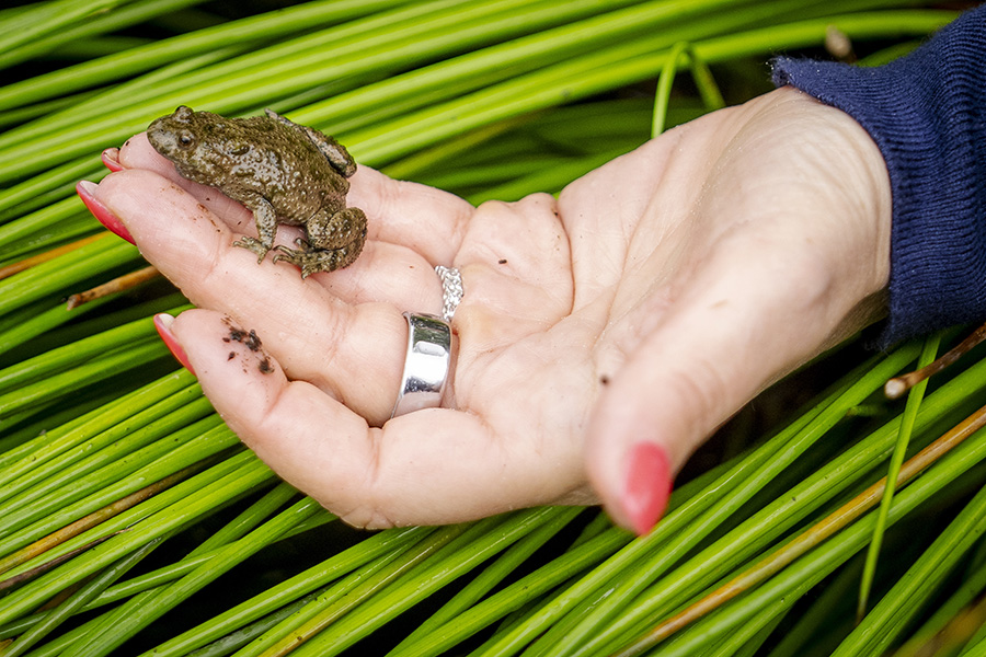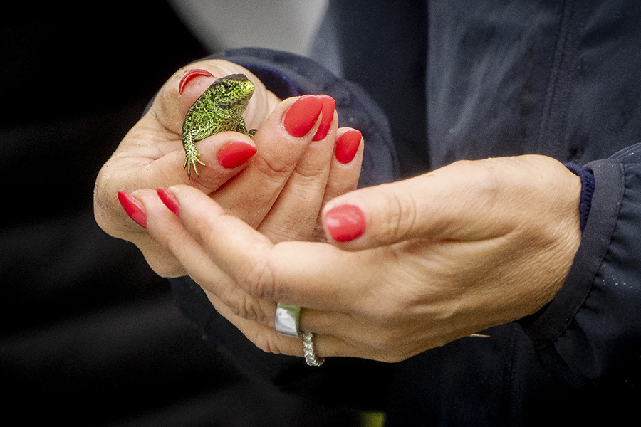Ett oväntat inslag blev när drottningen, iklädd sina vandringskängor, trendig Moncler-väst och en vindtät jacka i WWF-grönt, bekantade sig med små groddjur.