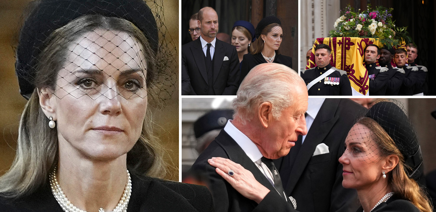 Prinsessan Kate i helsvart klänning och hatt med flor. Bild: Aaron Chown/AP/TT