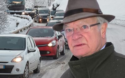 Kungen stoppad på OS – fast i snökaoset mitt i Alperna
