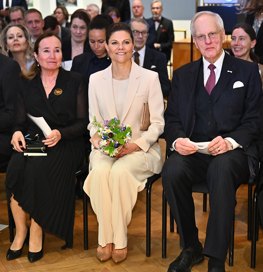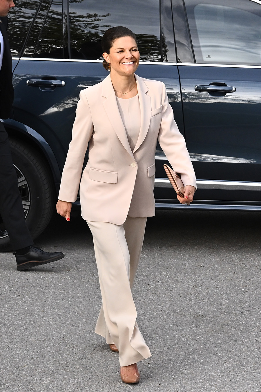Kronprinsessan Victoria bar en elegant beige kostym och strålade glatt under det trevliga evenemanget.