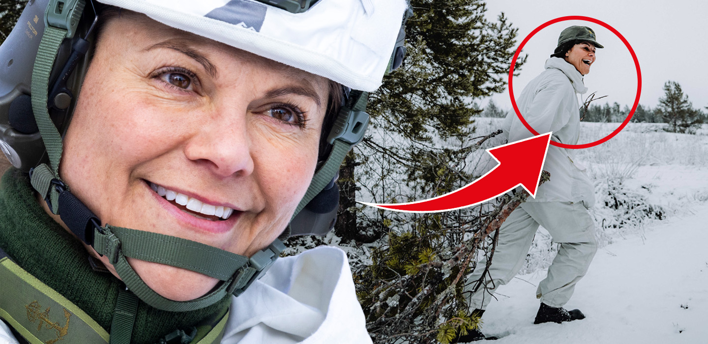Mitt i vinterlandskapet syns kronprinsessan Victoria kämpa sig fram genom drivorna tillsammans med militärerna under en av arméns övningar.