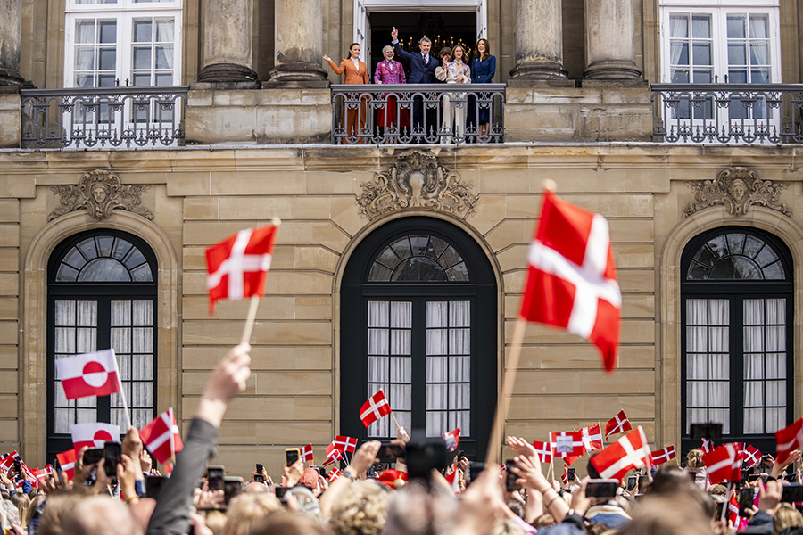 När kung Frederik och drottning Mary, 53, steg ut på balkongen möttes de av en jublande folkmassa som viftade med Dannebrogsflaggor och sjöng födelsedagssånger.