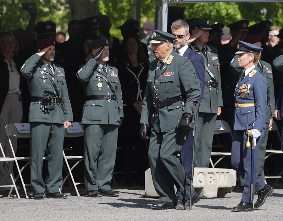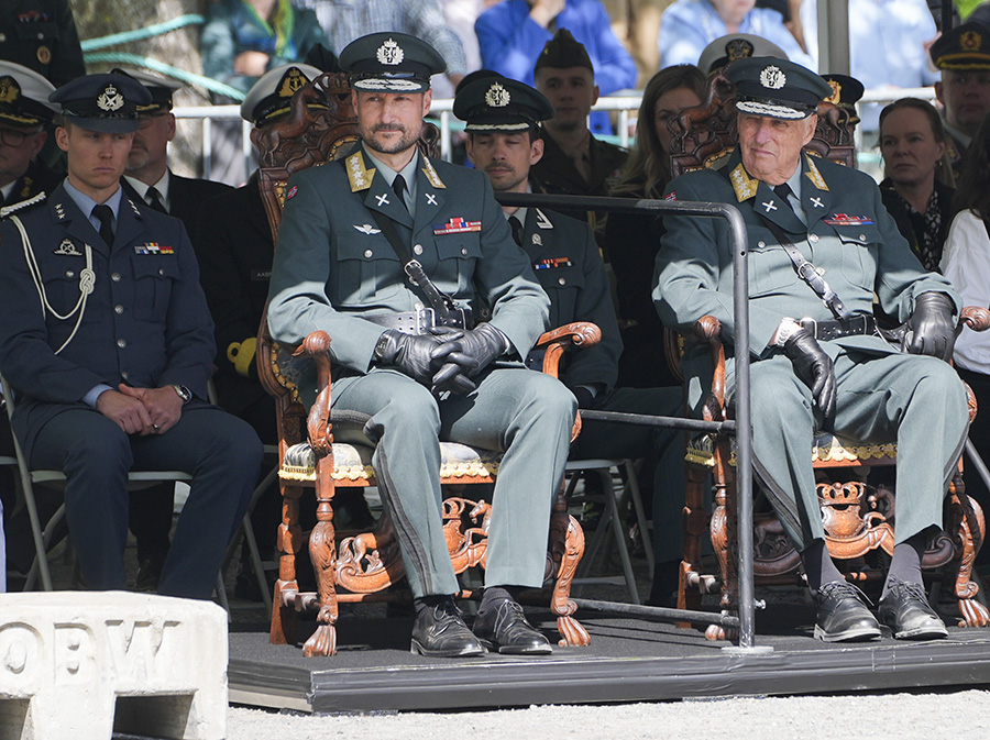 I år hölls huvudceremonin vid Akershus fästning i Oslo, där kung Harald i uniform närvarade tillsammans med kronprins Haakon, 51, statsminister Jonas Gahr Støre, 64, och försvarsledningen.
