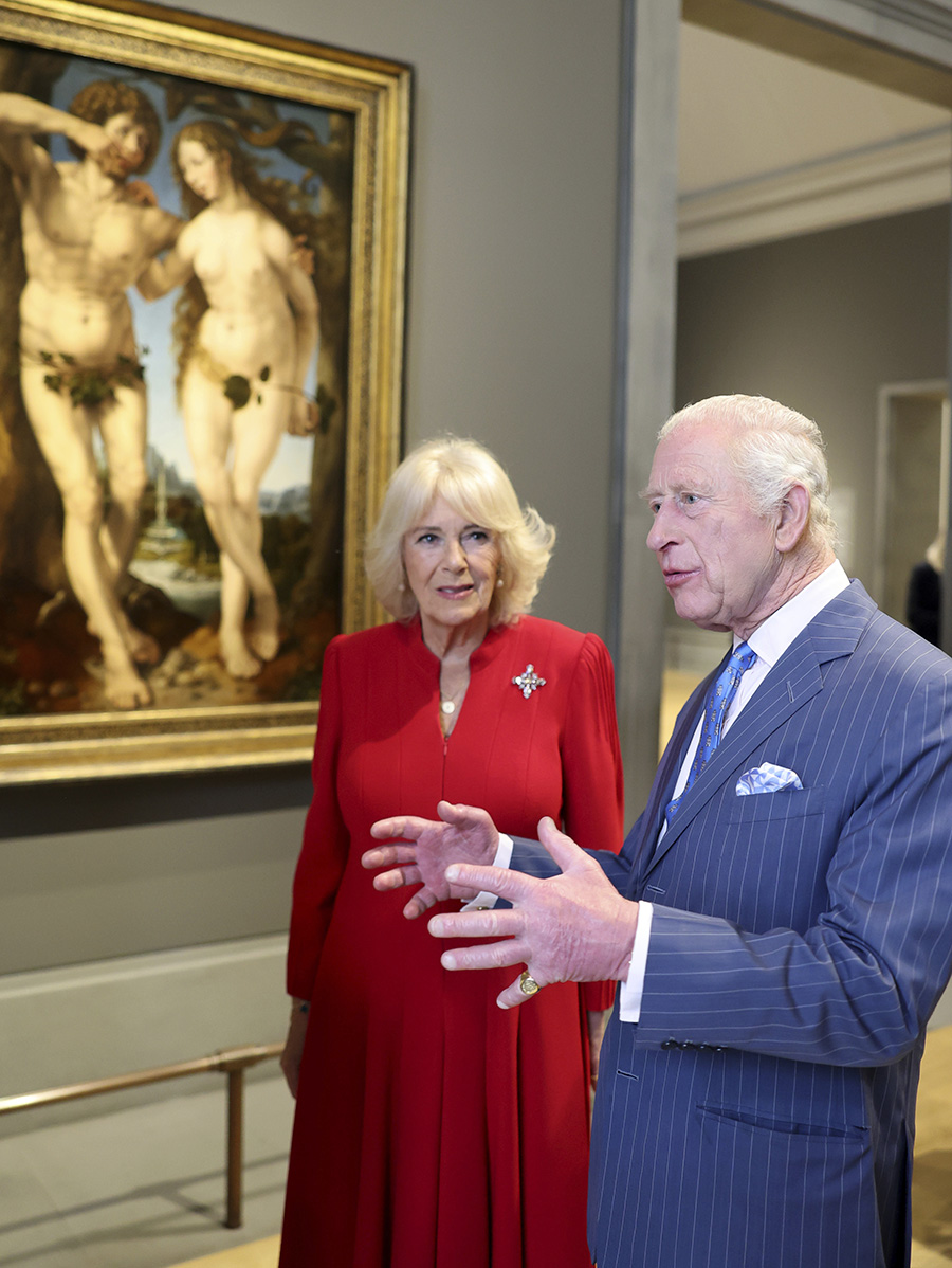 Kung Charles, 77, och drottning Camilla, 77, möttes med pompa och ståt när de fick sina officiella porträtt från kröningen avtäckta på National Gallery i London.