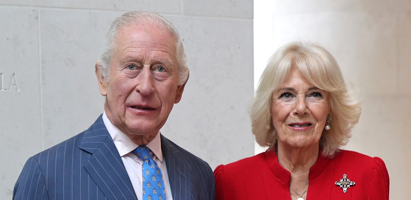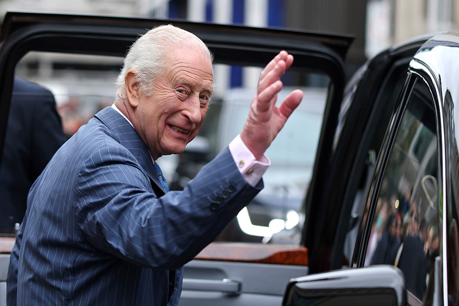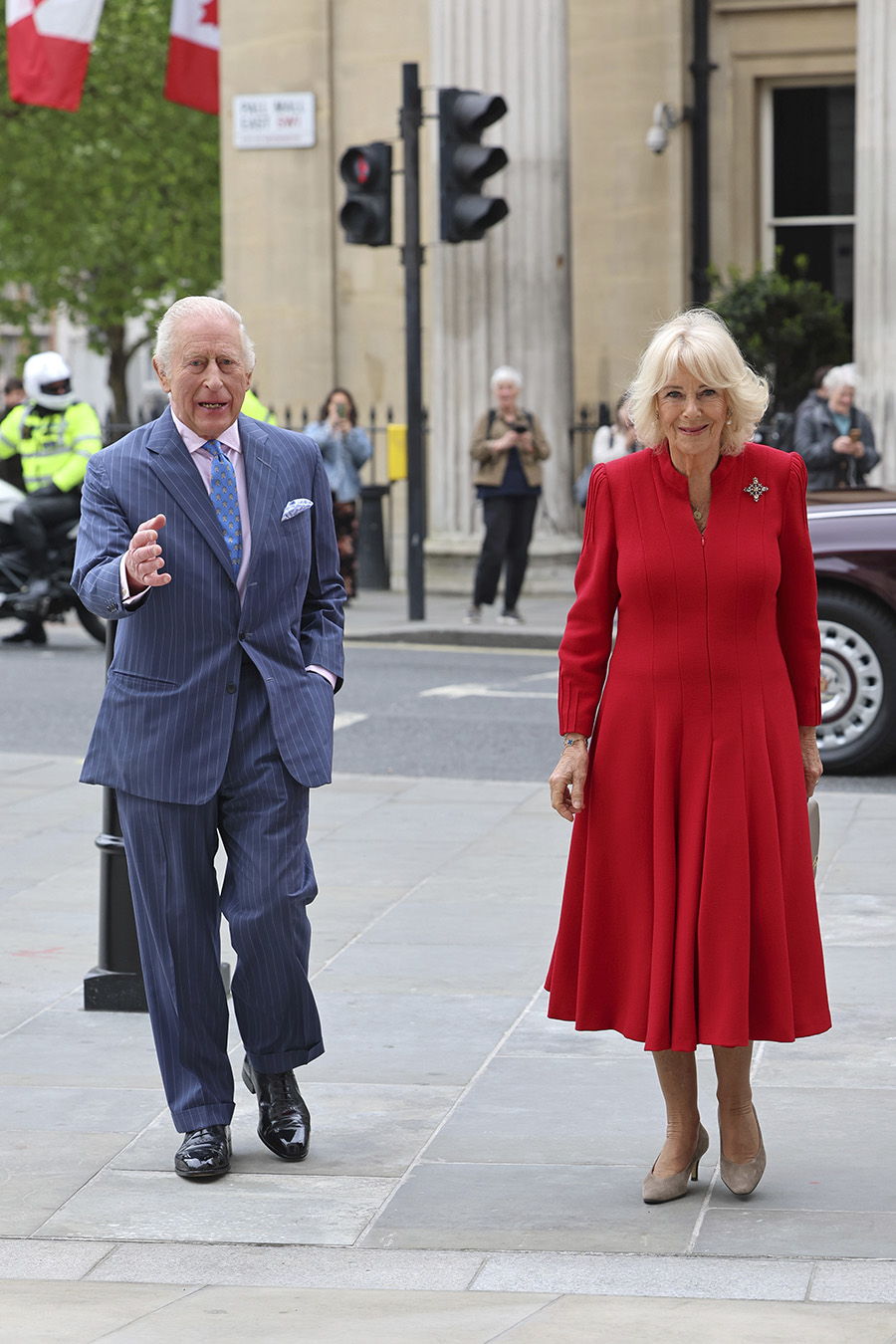 Klädd i en mönstrad slips med slottstema och en elegant marinblå, kritstrecksrandig kostym gick Charles med bävan uppför trapporna, åtföljd av hustrun Camilla som bar en klarröd klänning.