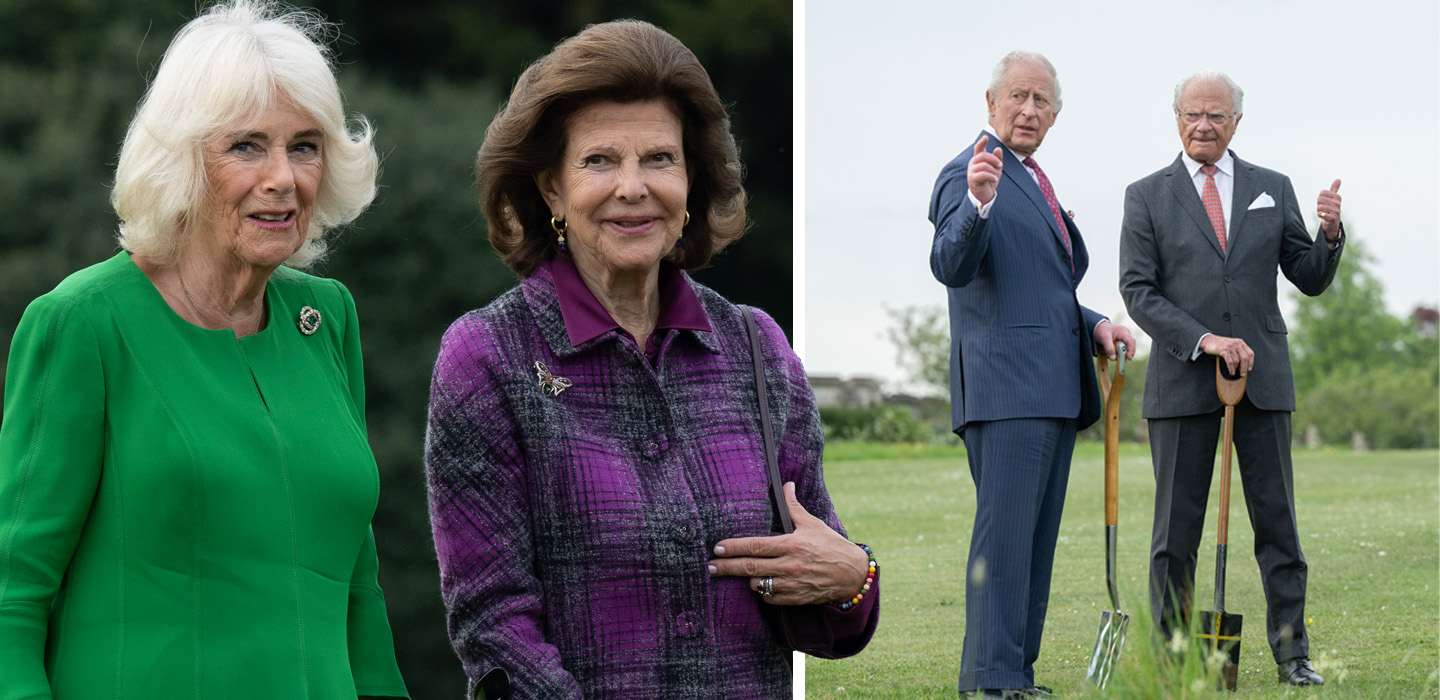 Under ceremonin i slottsparken hjälpte kung Carl Gustaf till med spadtagen medan Charles placerade trädet.