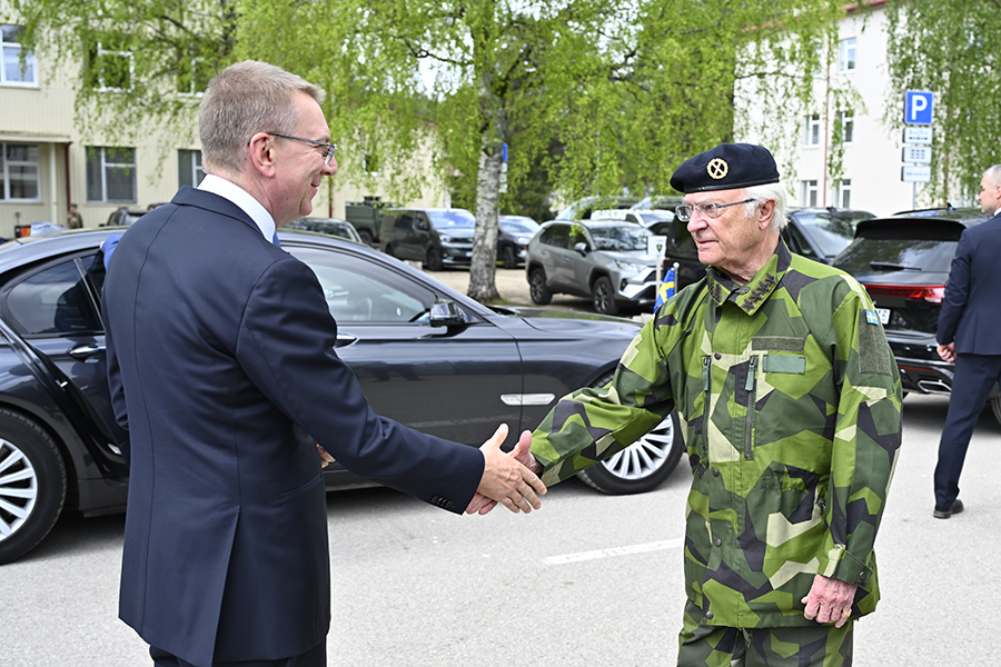 Under sitt besök på militärbasen Ādaži i Kadaga, norr om Riga, bytte kungen sin traditionella kostym mot en kamouflagefärgad fältuniform, vilket markerade hans roll som Försvarsmaktens främste representant.