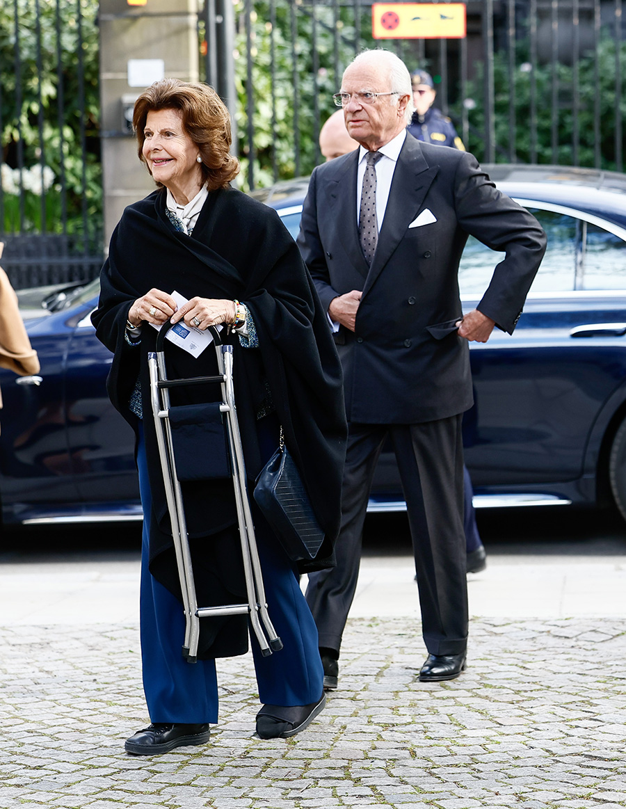 När kungaparet anlände bar drottning Silvia på ett nytt hjälpmedel efter sin operaton, som uppges vara en bärbar och utfällbar specialstol.
