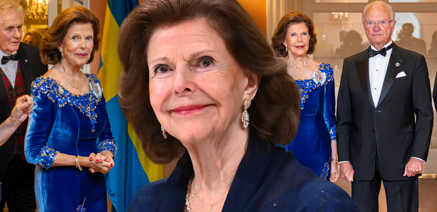 Och mitt i allt – drottning Silvia, 81, i en av sina mest spektakulära festklänningar på länge.