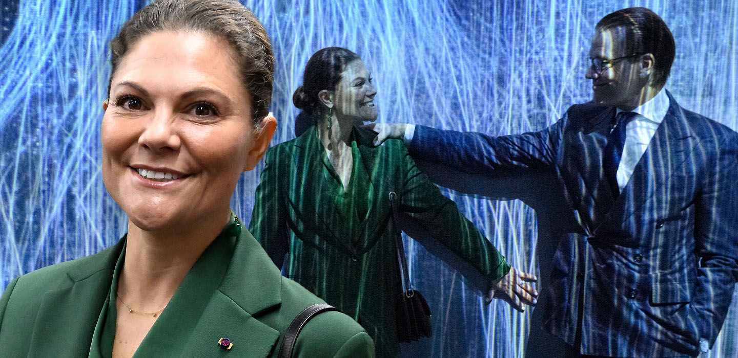 Victoria strålade ikapp med de färgexploderande projektionerna i sin smaragdgröna kostym, medan prins Daniel, stilig som alltid i sin mörka dubbelknäppta kostym, höll ett öga på tekniken – och på sin fru, som tydligt var i sitt esse.