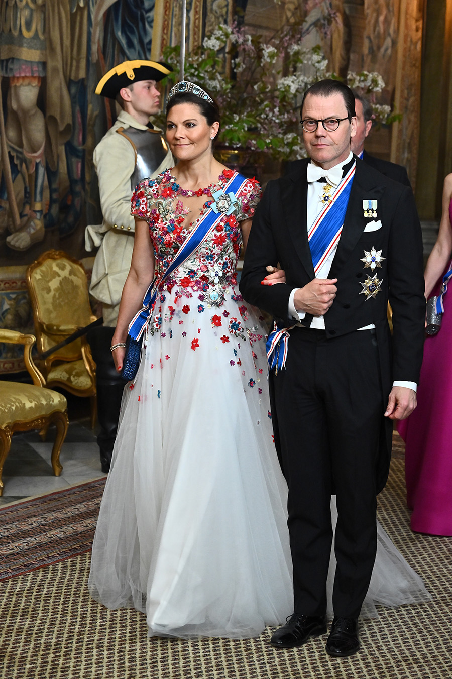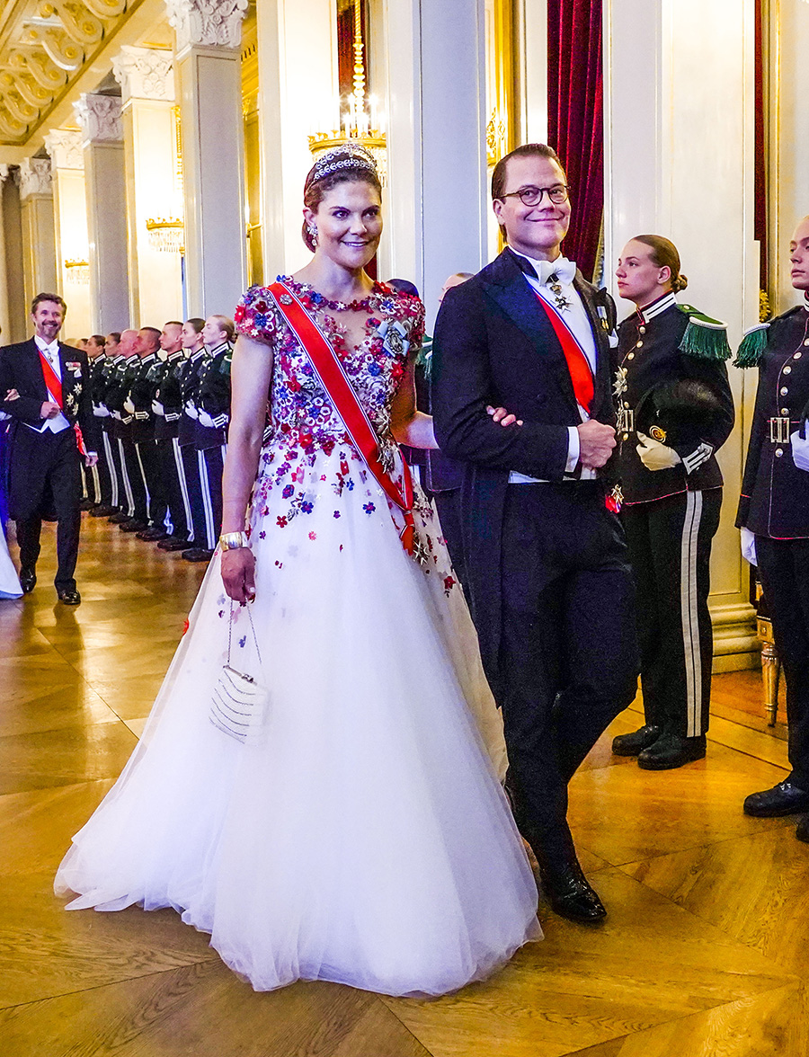 När Victoria gjorde entré med prins Daniel, 51, var det i en bedårande vacker klänning från Frida Jonsvens Couture, en blommig överdel kombinerad med en luftig tyllkjol.