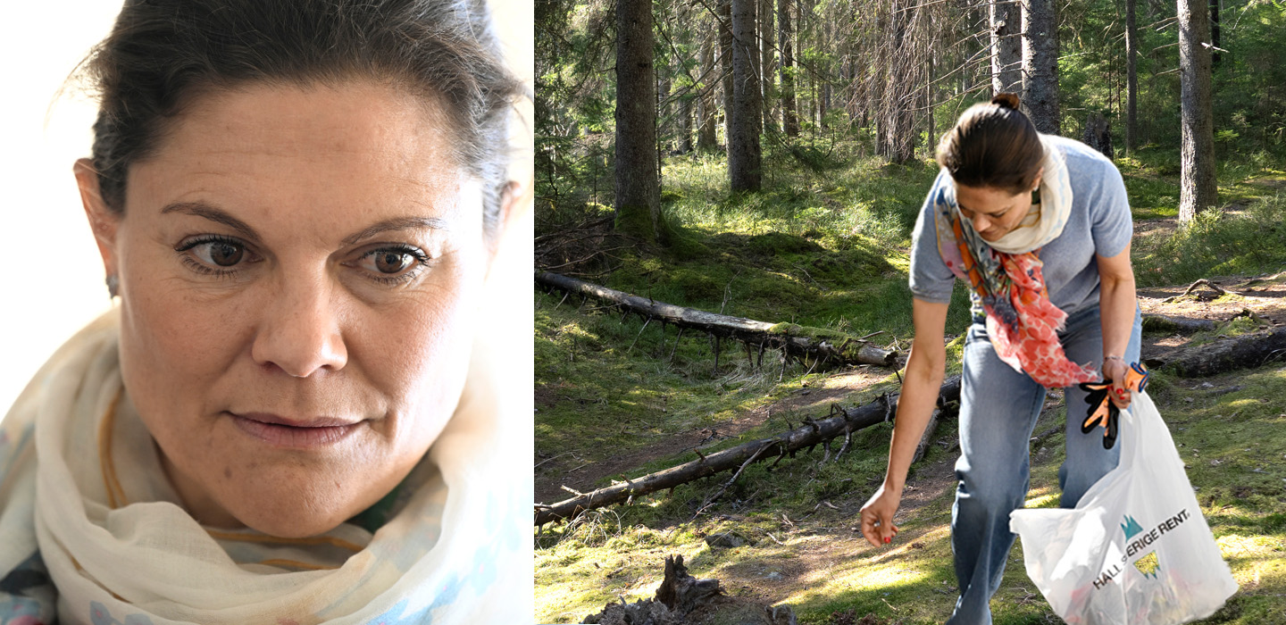 Kronprinsessan Victoria visar allvarligt upp skräpet som slängts i skogen. Bild: Instagram/Kungahuset