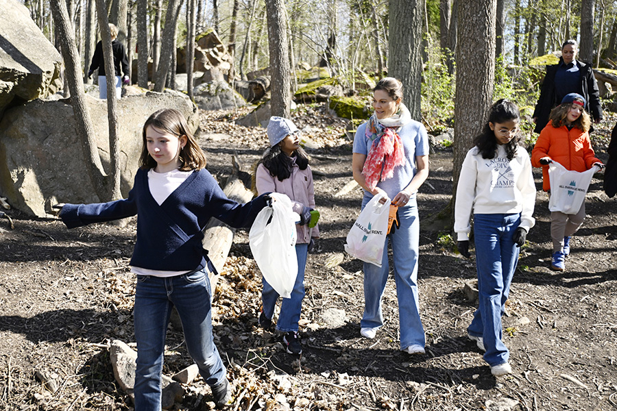 Under den soliga vårdagen samlade kronprinsessan och de 11-åriga eleverna skräp i skogen, ett praktiskt sätt att bidra till miljöarbetet.